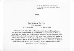 Als 14jährige Vollwaise; kam nach Krefeld; ∞ 30.6.1934 Josef Belka, † 1963; lebten seit 1937 in Mödrath; 2 Söhne, 1 † 1946; Mann im Krieg, Gefangenschaft bis 1949; in Mödrath u. Horrem; letzten Jahre in Buir |