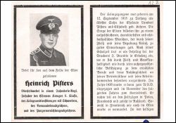 Gefallener 2. Weltkrieg; Tod bei Kämpfen um Leningrad; Eltern: Lambert Pisters u. Elisabeth geb. Kehren; Lehre in der Druckerei J. Brandts in Erkelenz; 1936 RAD; Nov. 1937 Heeresdienst; Feldzüge in Polen, Frankreich, zuletzt Russland; ∞ 1941 Anna Sommerfeld |
