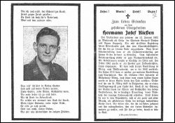 Gefallener 2. Weltkrieg; Eltern: Gerhard Rießen u. Agnes geb. Huppertz; Installateurlehrling; RAD; 1942 als Funker nach Westfrankreich; ∞ 25.10.1944 Wilhelmine Mäntz; Tod bei Tieffliegerangriff; vgl. Nr. 41882 |