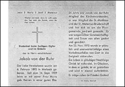Tod durch verkehrsunfall; ∞ 14.9.1929 Maria Heinen; 25 J. Mitgl. Kirchenvorstand; Mitgl. St. Matthias- u. St.-Maternus-Bruderschaft; Druck in Rickelrath |