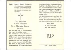 ∞ 18.2.1928 Witwer Johann Rütter, † 1951, u. wurde dessen 2 Kindern eine gute Mutter; Druck in Erkelenz |
