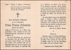 Eltern: Peter Joseph Küpper u. Petronella geb. Oellers; ∞ 15.9.1907 Franz Schmitz aus Welldorf; 4 K., davon 1 †; Druck in Jülich |