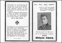 Gefallener 2. Weltkrieg; Eltern: Wilhelm Schmitz u. Helene geb. Schiffer; Bäckerhandwerk; Jan. 1942 zur Wehrmacht; Juni 1942 nach Russland, b. Kämpfen um Neval schwer verwundet; mehrere Operationen; dann Lungenentzündung |