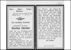 Jungfrau; Tod b. Eisenbahnunglück auf dem Bahnhof in Düren; noch 3 weitere Reisende tot aus den Trümmern hervorgeholt; Eltern: Peter Schröder u. Maria geb. Winters; Mitgl. Jungfrauenkongregation |