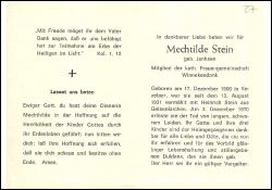 Mitgl. kath. Frauengemeinschaft in Winnekendonk; ∞ 13.8.1931 Heinrich Stein aus Gelsenkirchen; langes, schweres Leiden; 3 überlebende Kinder |