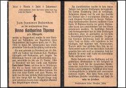 Weilte in Beggendorf zur Teilnahme an einer Beerdigung, dablei plötzlich † durch Herzschlag; Eltern: Hubert Matthias Offergeld u. Katharina geb. Engels; ∞ 23.11.1904 in Siersdorf Land- u. Gastwirt Franz Hubert Thoma; 10 K., davon 4 früh †, 3 Söhne als Erwachsene †; Druck in Jülich |