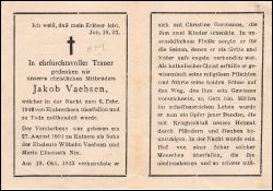In der Nacht von Einbrechern (ehem. Zwangsarbeiter) überfallen und zu Tode misshandelt; Eltern: Wilhelm Vaehsen u. Maria Elisabeth Nix; ∞ 19.10.1923 Christine Gormanns; 2 K.; Opfer jener Banden, die seit Kriegsschluss unsere Heimat durch Plündern und Rauben beunruhigen; sein Hof wurde von einer Schar solcher Menschen überfallen, niegerschossen, misshandel; starb im Krankenhaus in der Nacht zum 7.2. an den Folgen |
