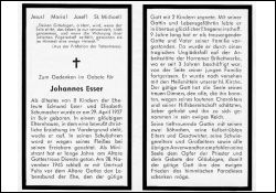 Eltern: Edmund Esser u. Elisabeth Schumacher; ∞ 28.11.1945 Gertrud Fuhs (Fuß); 2 K.; Tod nach 9 J. Ehe durch Unglücksfall auf seiner Arbeitsstätte (Horremer Brikettfabrik) |