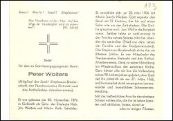 Mitgl. St. Stephanus-Bruderschaft, Theaterverein Eintracht u. Kath. Arbeiterverein; Eltern: Hubert Johann Wolters u. Maria Katharina Schröder; ∞ 25.5.1906 Maria Josefa Nießen, † 1.6.1955; 12 K., davon 11 †; Mitwirkung beim Wiederaufbau der Kirche |