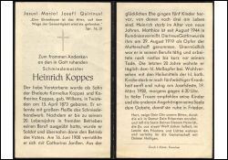 Schmiedemeister; Eltern: Kornelius Koppes u. Katharina geb. Willems; übernahm Betrieb des Vaters; ∞ 16.6.1908 Catharina Janßen; 5 K., davon 2 † (Heinrich mit J., Matthias seit August 1944 im 2. Weltkrieg vermisst); Druck in Kevelaer |