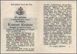 Gefallener 2. Weltkrieg; Eltern: Peter Krumm u. Margarethe geb. Mörkels; Nov. 1939 zum Heeresdienst; verlobt; Aug. 1944 in russische Kriegsgefangensc haft; Arbeit im Bergwerk; Tod durch Bergwerksunglück; Todesnachricht erreichte die Familie erst nach Kriegsende (vor März 1946) |