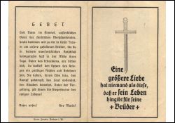 Gefallener 2. Weltkrieg; am 2.4.1943 schwer verwundet b. Kämpfen am Kuban; Heldenfriedhof Saporoshje; Pflegesohn; verlobt; Druck in Beckum i. W. |