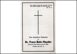 Gefallener 2. Weltkrieg; Eltern: Dr. Fritz M. Behr-Heyder u. Johanna geb. Heyder; Volksschule Rodenkirchen; Gymnasium Kreuzgasse; Medizinstudium; 1940 Einberufung zum Heeresdienst; nach Studiumurlaub 1941 zurück an die Front |
