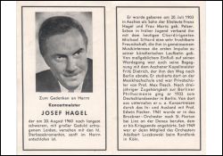 Konzertmeister; langes, schweres Leiden; Eltern: Franz Hagel u. Maria geb. Pelzer; Freundschaft mit Chordirigent Michael Sittard; Studium Musikhochschule Berlin; 3 J. Mitgl. Berliner Philharmonie; 1932 zum Deutschlandsender in Berlin; Konzertreisen im In- u. Ausland mit Prof. Edwin Fischer; 1941 in das Bruckner-Orchester nach St. Florian b. Linz an der Donau berufen; seit 1949 Mitgl. des Orchesters Adelbert Luczkowski beim Rundfunk in Köln; 1925 ∞ Ella Brammertz |