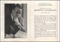 Eltern: Konrektor Anton Watermann u. Therese geb. Führing, früh †; Vater ∞ Margarete Meerfeld, die sich der 6 K. annahm; Quirinus-Gymnasium in Neuss; 1927 Chefarzt des Orthopädischen Kopernikus-Krankenhauses i Frauenburg/Ostpreußen, das nach seinen Plänen erbaut wurde;25.7.1925 ∞ Hedwig Gethmann aus Münster, Tochter des Bankdirektors Rudolf Steimann u. Hedwig geb. Gethmann; 6 K.; 1938 Habilitation in Königsberg; 1942 Professor für Orthopädie in Danzig, Direktor der dort von ihm gegründeten Orthop. Klinik; Soldat im 2. Weltkrieg; brachte viele Verletzte aus Danzig nach Kopenhagen in Sicherheit; nach dem Krieg und schweren Jahren Orthop. Privatklinik in Düsseldorf; zahlr. wissenschaftliche Ehrungen |