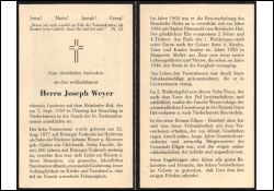 Landwirt auf dem Reisdorfer Hof; Eltern: Johann Weyer u. Eleonore Claßen aus Güdderath; Familie seit 200 J. auf Rittergut Vockrath ansässig; übernahm 1905 Bewirtschaftung des Reisdorfer Hofes; ∞ 1906 Sophie Dünnwald vom Reisdorfer Hof, † am Ende des 1. Weltkrieges nach Geburt des 6. K.; 6 K.; ∞ 1920 Margarete Meller aus Zons, † 1946; Sohn Franz im 2. Weltkrieg gefallen; Familie musste schließlich infolge der wirtschaftl. Umwälzungen in der Heimat (Braunkohle) nach Niederbayern übersiedeln; blieb der alten Heimat Elfgen-Reisdorf verbunden, wo er lange Jahre Gemeindeverordneter u. zeitweilig Bürgermeister der Gemeinde Elfgen war |