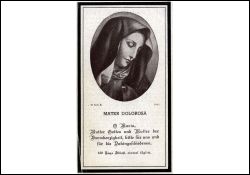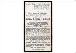 ∞ Michael Schunk, †; Mitgl. Rosenkranz-Bruderschaft, der Ehrenwache u. des Müttervereins; Goldenes Ehrenkreuz der deutschen Mutter; 3 überlebende Kinder; Druck in Koblenz |