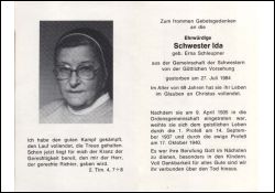 69 J.; 9.4.1935 Eintritt in die Gemeinschaft der Schwestern von der Göttl. Vorsehung; 1. Profess 14.9.1937; 2. Profess 17.10.1940 |