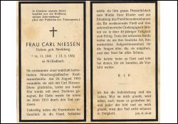 Entstammte einer Kaufmannsfamilie; ∞ 24.8.1903 Carl Niessen, † 1913; 2 Töchter; führte 40 J. lang das Familienunternehmen zuim Erfolg; |
