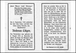 18 J. als Kaufmann in Brauweiler tätig; Eltern: Josef Lölgen u. Maria geb. Pauli; ∞ 1.4.1921 Johanna Schrey; 1 K., früh †; Tod infolge eines tragischen Unglücksfalles |