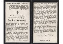 Jungfrau; Lungenentzündung; Eltern: Andreas Krzymyk u. Maria geb. Kollek; Druck in Langenfeld, Rhld. |