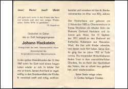 Mitbegründer des kath. Arbeitervereins Alpen; Ehrenmitgl. Bürgerschützenverein Menzelenerheide; Eltern: Gerhard Hackstein u. Johanna geb. Mons; ∞ 12.9.1911 Katharina Huhsmann (Hußmann) aus Menzelen-West, † 1952; 8 K., davon 3 †; |
