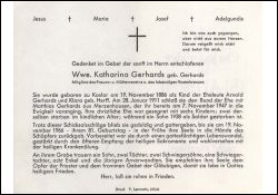 Mitgl. Frauen- u. Mütterverein u. des.Lebendigen Rosenkranzes; Eltern: Arnold Gerhards u. Klara geb. Herff; ∞ 28.1.1911 Matthias Gerhars aus Merzenhausen, † 7.11.1947; 6 K., davon 2 früh †, 1 Sohn 1938 als Soldat gestorben; Druck in Jülich |