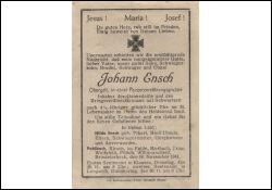 Gefallener 2. Weltkrieg; 34 J.; Heirat vor 4 1/2 J.; Datum des Totenzettels: 18.11.1944; Wohnort: Pohlbach, Pfarre Klausen; Druck in Schwalch, Mosel |