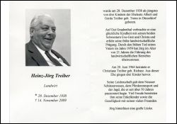 Landwirt; Eltern: Albert Treiber u. Gerda geb. Trenn; Kindheit auf Gut Gnadenthal /mit Schwestern Eve-Gret u. Christa); früher Tod des Vaters 1959, übernahm deshalb mit 21 J. die Führung des landw. Betgriebs; ∞ 20.6.1964 Christiane Richarz; 3 K.; seine Leidenschaft galt dem Neusser Schützenwesen, dem Pferdesport u. der Jagd |