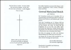 Eltern: Josef Denhoven u. Katharina geb. Coenen; ∞ 15.2.1939 August Broich aus Niederweis, Kr. Bitburg; 8 K.; seit 1992 auf dem Conradshof in Hasselsweiler, dem Geburtshaus ihrer Mutter |