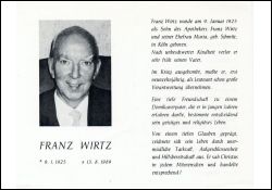 Eltern: Apotheker Franz Wirtz u. Maria geb. Schmitz; im Krieg ausgebombt; Leutnant im 2. Weltkrieg; Apotheker; Wiederaufbau der väterlichen Apotheke; ∞ 30.8.1952 seine Kollegin Ruth Decker; 3 K.; lange, schwedre Krankheit |