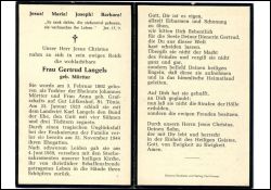 Schweres Leiden; Eltern: Johannes Mörtter u. Anna geb. Grafschafts; ∞ 23.1.1923 Landwirt Karl Langels; 7 K.; Ehegatte bei der Evakuierung am 22.11.1944 durch Unglücksfall †; Druck in Düren |