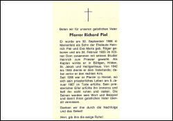 Eltern: Heinrich Piel u. Eva Maria geb. Röger; Priesterweihe Köln 24.2.1933; Kaplan in Büttgen, Hilden, St. Jakob u. Heiligenhaus; 1942-45 im 2. Weltkrieg, verlor rechten Arm; seit 1956 Pfarrer in Hersel |