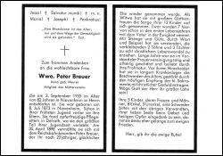 Seit frühester Jugend bei Pflegeelternin Delrath; ∞ 30.4.1898 Reichsbahnbeamter Peter Breuer, † nach 22 J.; 12 K., davon 7 †; Mitgl. Mütterverein; |