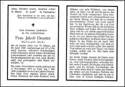 Schlaganfall; ∞ 7.5.1893 Jakob Deuster; 10 K., davon 2 mit 38 u. 36 J. †; Goldhochzeit |