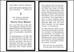 Längeres, schweres Leiden; Eltern: Heinrich Müller u. Helene geb. Siefen; ∞ 19.11.1919 Maria Gros; 2 K.; fast 30 J. beim Wasserwerk Köln-Weiler beschäftigt; |