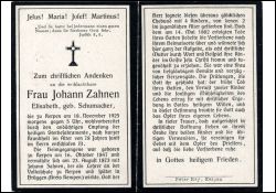 ∞ 23.8.1873 Johann Zahnen Lehrer in Kerpen, später in Brüggen, Kr. Kempen, † 14.5.1882; 4 K., davon 2 jugendl. †; als Witwe Rückkehr mit den Kindern nach Kerpen |