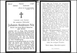 Eltern: Peter Wilhelm Nix u. Maria Katharina geb. Linnartz; ∞ in Gohr 2.5.1891 Anna Sibilla Hubertine Schmitz, in Rosellerheide 15..11.1862 als Tochter v. Heinrich Schmitz u. Agnes geb. Felten; 7 K., davon 1 frrüh †, 1 Tochter jugendl. †, 1 Sohn im 1. Weltkrieg gefallen; Landwirt; langjähriger Kirchenschweizer; |
