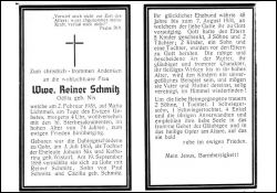 Eltern: Johann Nix u. Katharina geb. Wistorf; ∞ 19.9.1885 in Gohr Reiner Schmitz, Sohn von Paul Schmitz u. Cäcilia geb. Schmitz; Gattin † 7.8.1931; 5 K., davon 2 †; |