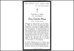 Jahrelanges Leiden; Eltern: Peter Odendahl u. Anna Christine geb. Mähler; ∞ 16.2.1928 Josef Flüss aus Wipperfürth im Quirinusmünster in Neuss; 1 Tochter; Druck in Dormagen |