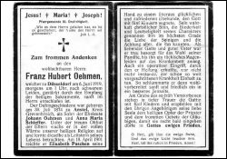 Schweres Magenleiden; Operation schaffte keine Erleichterung; Eltern: Johann Oehmen u. Anna Maria geb. Schieffer; ∞ 18.4.1901 Elisabeth Paschen; 5 K. |