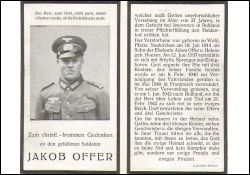 Gefallener 2. Weltkrieg; Eltern: Adam Offer u. Helene geb. Hoesen; ∞ 12.6.1937 Sibylla Sprenger aus Evinghoven; 3 K.; 8.2.1940 Einberufung; Mai 1940 in Frankreich verwundet; 1.1.1942 nach Russland |