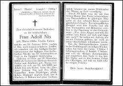 Langes, schweres Leiden; Eltern: Heinrich Palms u. Adelheid geb. Theiss (Theis); ∞ 15.7.1899 Adolf Nix aus Gohr, Sohn v. Johann Nix u. Eva Maria geb. Cappellen; 4 K., davon offenbar 1 Tochter †; seit 20 J. trug sie das schwere Nervenleiden ihres Mannes mit; |