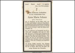 Lange, schwere Krankheit; ∞ 3.8.1901 Werner Schnee aus Straberg, Witwer mit 4 K.; 6 gemeinsame Kinder |