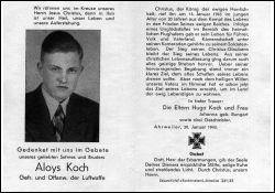 Gefallener 2. Weltkrieg; 20 J.; Tod durch Unglücksfall im Bereich des heimatl. Fluhafens; Eltern: Hugo Koch u. Johanna geb. Bungart; Wohnort: Ahrweiler |