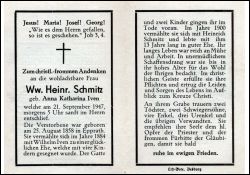 ∞ 1884 Wilhelm Iven, †; 4 K., davon 2 †; ∞ 1900 Heinrich Schmitz, † 1913; Druck in Bedburg/Erft |