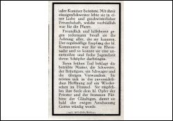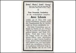 Jungfrau; Eltern: Engelbert Schmitz u. Katharina geb. Wilbertz; früher Tod des Vaters; verlobt; Druck in Bedburg/Erft |