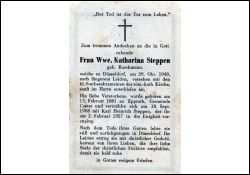 Längeres Leiden; ∞ 18.9.1908 Karl Heinrich Steppen, † 2.2.1927; lebte als Witwe in Düsseldorf |