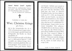 ∞ 8.7.1916 Johann Krings, † 25.5.1939; 4 Söhne, davon 2 im 2. Weltkrieg gefallen; seit Jahren kränkelnd |