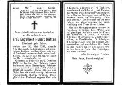 Eltern: Jakob Pullen u. Anna Gertrud geb. Fischermann; ∞ 18.10.1890 Engelbert Hubert Rütten aus Gohr; 40 J. Ehe; 8 K., daon 4 †; Wohnort: vermutl. Gohr |